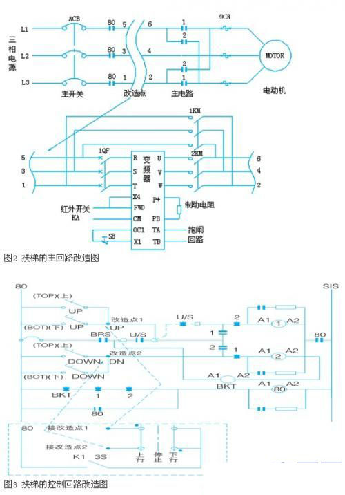 (2)控制回路的改造。扶梯的大部分保護電路都在控制回路。如果在改造中去掉了原有的部分保護電路或者改動了原有保護方式,都會影響扶梯的正常工作,甚至造成扶梯報故障??紤]到該因素,在改造過程中,不能改變原有保護電路,僅僅選擇了兩個點進行改造,如圖3所示。9Pk廣州南創(chuàng)電子科技有限公司