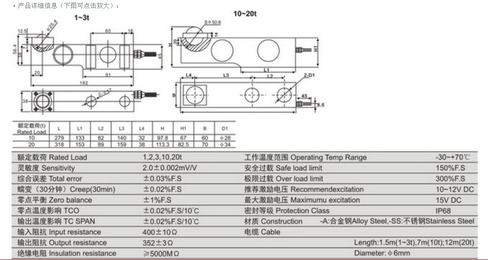 柯力SB-A-20T傳感器測量精度:±2.0%(常用點校準后誤差可小于0.05%),±0.3℃XuK廣州南創(chuàng)電子科技有限公司