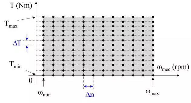 速度范圍 (ωmax-ωmin) 被分成多個等間距 Δω,合理的數(shù)量為 10 到 20。每個速度,扭矩變化也同樣按合理的點10到20,分成步進 ΔT 。結(jié)果就獲得了 扭矩-轉(zhuǎn)速 網(wǎng)格圖,包含 N = n x m 個點。pUG廣州南創(chuàng)電子科技有限公司