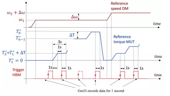 如圖所示,一個操作點持續(xù)了3秒。電機控制器產(chǎn)生了一個 TTL 信號給 HBM 數(shù)據(jù)記錄儀,當(dāng)上升沿觸發(fā)被檢測到,數(shù)據(jù)記錄儀存儲了一秒的數(shù)據(jù)。按照所選操作點的數(shù)量,完整的過程持續(xù)了10到20分鐘。