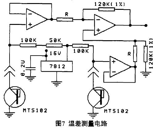 實(shí)際溫差測(cè)量電路如圖7所示。由于要測(cè)量溫度差值,所以電路中必須要用到兩個(gè)溫度傳感器。而兩個(gè)溫度傳感器分別經(jīng)同相單位增益放大器緩沖后,再接到差分放大器的兩端,根據(jù)Van的極性和大小,即可知道兩個(gè)溫度傳感器哪個(gè)測(cè)得的溫度高及溫差大小。為了測(cè)溫的精度這里要求兩個(gè)傳感器的性能要相同或相近,這樣在同一溫度下,可調(diào)節(jié)到Votr=O.OOOV。