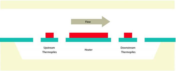 MEMS流量傳感器可利用單個或多個加熱器和溫度傳感器來制造。一種簡單的制造方法就是兩個溫度傳感器圍繞一個加熱器,并對稱地放置在左右兩邊。當加熱器(即電阻)通過電流加熱時,加熱器周圍就會形成穩(wěn)態(tài)溫度曲線。當氣體(介質)不流動時,對稱的兩個溫度傳感器就會檢測到相同的溫度。當氣體流動時(如從左到右),熱空氣從左向右吹,此時,傳感器的溫度讀數就是右邊高于左邊。由于溫差與流速成正比(低流速時呈線性&高流速時呈非線性),我們可通過測量兩個溫度傳感器的溫差來確定流量。4tK廣州南創(chuàng)電子科技有限公司