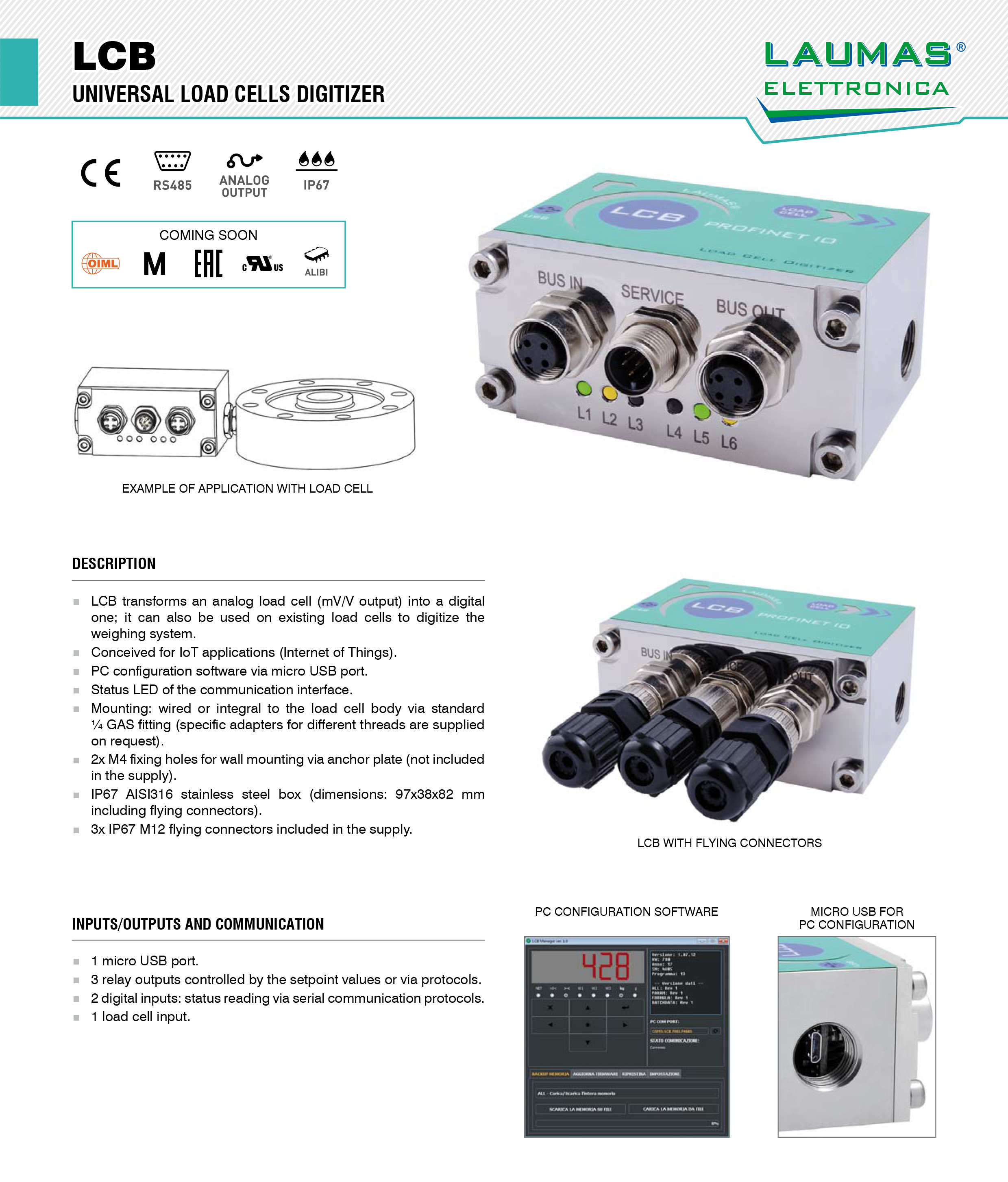 LCB重量變送器用于稱(chēng)重傳感器的數(shù)字化儀/重量變送器,著眼于物聯(lián)網(wǎng)(物聯(lián)網(wǎng))(物聯(lián)網(wǎng))。IP67接線盒由AISI 316不銹鋼制成,適用于惡劣環(huán)境。三個(gè)IP67 M12連接器。通訊接口的六個(gè)指示燈。尺寸:97 x 38 x 82毫米(包括連接器)。FHE廣州南創(chuàng)電子科技有限公司