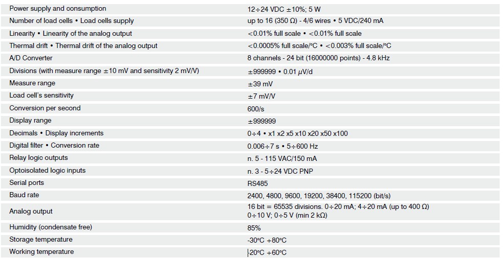 Weight transmitter with backlit graphic LCD display, 60x32 mm, 128x64 pixels. Four-key keypad for the system calibration. TEST key for direct access to the diagnostic functions. Dimensions: 148 x 92 x 60 mm.The TLM8 offers the benefits and performance of an advanced digital weighing system even using analog load cells. 8 independent reading channels for load cells. Digital equalization. Automatic diagnostics.