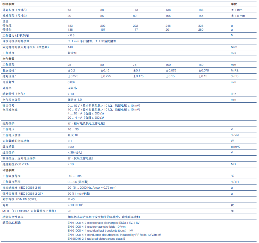 雖然德國諾沃泰克novotechnik線性位移傳感器TFD-4021-824-211-421線性位移傳感器是變壓器的一種,但是需要一個固定振幅及頻率的AC 電源才能正常地操作。此電源和一般所知的AC 電源不同,通常是3Vrms @2.5kHz ~ 3.0kHz 。供給諾沃泰克novotechnik電子尺TFD-4021-824-211-421線性位移傳感器所需之激磁電源,是一般我們所知之線性位移傳感器信號放大器所具備的功能之一。其他的功能包括將LVD T 的低準位AC 輸出電壓轉換為高準位的DC 信號,在使用上會比較方便。另外,當線性位移傳感器的鐵心通過原點時,利用相位檢出器可從180 度的相位移來判斷鐵心移動的方向,以及輸出信號的零點準位調整。圖-6 所示為右側內含放大器之D諾沃泰克TFD-4021-824-211-421線性位移傳感器線性位移傳感器的剖面圖,放大電路之模塊應有封膠保護,但為了說明起見,未顯示出來。為什么要采用線性位移傳感器位移傳感器?由于線性位移傳感器位移傳感器本身操作之基本物理原理或本身結構所采用之材料及技術,因而具備某些特性和優(yōu)點。無摩擦操作線性位移傳感器最重要的特性之一就是無摩擦操作。在一般的操作之下,TFD-4021-824-211-421電子尺線性位移傳感器的鐵心和線圈組件結構之間沒有機械式的接觸,如摩擦、拖曳或其他可造成摩擦之因素。此特性在材料測試,振動位移測量以及高分辨率尺寸測量系統(tǒng)特別有用。分辨率無限大測量極微小之鐵心位置的變化量。此無限解析之能力,只受限于線性位移傳感器信號放大器的分辨率和輸出顯示器的位數。因而,線性位移傳感器亦具有極佳之重復性。機械壽命無限長通常線性位移傳感器的鐵心和線圈組件結構之間沒有接觸,所以,沒有任何組件彼此之間會相互摩擦或磨損,TFD-4021-824-211-421電子尺NOVOTECHNIK此意味著線性位移傳感器具有無機械壽命限制之特性。此特性在高信賴度要求之應用方面,如航空器、衛(wèi)星、太空飛行器以及核能設備安裝等,特別的重要。另外,在很多工業(yè)過程控制以及工廠自動化控制系統(tǒng)方面,對此特性也有高度的需求。不會因為超出量測范圍而受損大部分線性位移傳感器的內膛兩端是沒有封閉的。若因操作不慎,超出其額定之量測行程,鐵心會完全通過傳感器的線圈組件結構,并不會造成任何的損壞。這種不因超出位移行程而破壞之特性,TFD-4021-824-211-421電子尺NOVOTECHNIK使得線性位移傳感器在材料破壞測試設備方面,如附著于測試組件以便測試其張力之張力計,是一個很理想的傳感器,參考HSTA750系列。HkG廣州南創(chuàng)電子科技有限公司